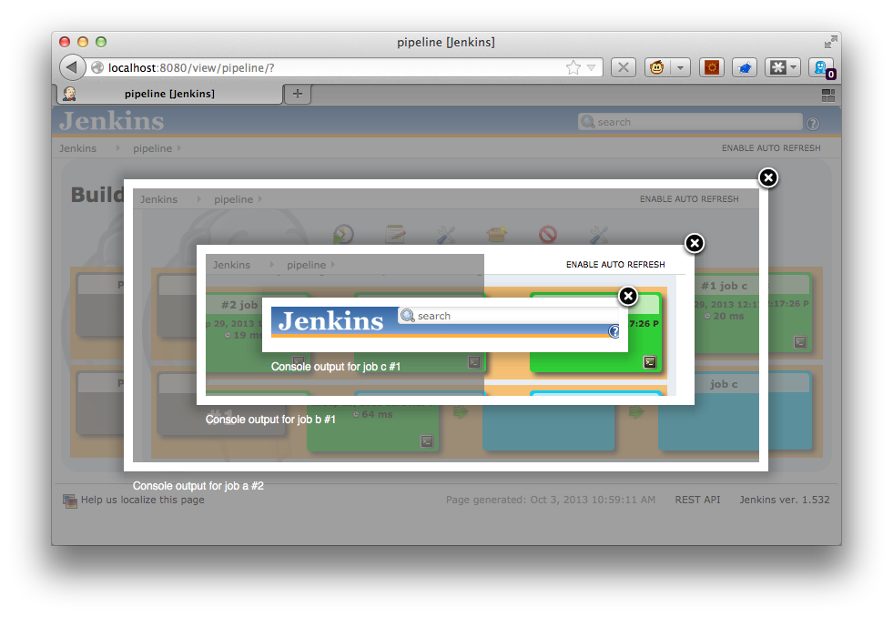 The default behavior for the build pipeline plugin is to open the Console Output in the lower right corner of a job in a lightbox.