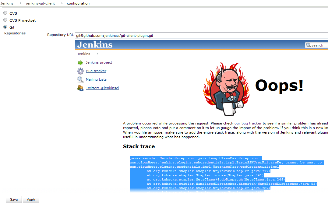 Using the latest experimental git plugin builds I am getting an error configuring the project SCM settings.