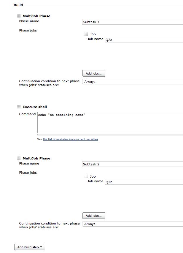 Job A has several steps. It executes A1 job, does something else (like a groovy script or env var injection step), and then A2, and then something else (another env var injection step).