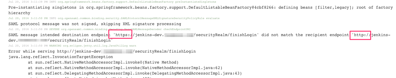 javax.servlet.ServletException: org.pac4j.saml.exceptions.SamlException: Error decoding saml message at org.kohsuke.stapler.Stapler.tryInvoke(Stapler.java:796) at org.kohsuke.stapler.Stapler.invoke(Stapler.java:876) at org.kohsuke.stapler.MetaClass$3.doDispatch(MetaClass.java:196) at org.kohsuke.stapler.NameBasedDispatcher.dispatch(NameBasedDispatcher.java:58) at org.kohsuke.stapler.Stapler.tryInvoke(Stapler.java:746) at org.kohsuke.stapler.Stapler.invoke(Stapler.java:876) at org.kohsuke.stapler.Stapler.invoke(Stapler.java:649) at org.kohsuke.stapler.Stapler.service(Stapler.java:238) at javax.servlet.http.HttpServlet.service(HttpServlet.java:790) at org.eclipse.jetty.servlet.ServletHolder.handle(ServletHolder.java:812) at org.eclipse.jetty.servlet.ServletHandler$CachedChain.doFilter(ServletHandler.java:1669) at hudson.util.PluginServletFilter$1.doFilter(PluginServletFilter.java:135) at hudson.util.PluginServletFilter.doFilter(PluginServletFilter.java:126) at org.eclipse.jetty.servlet.ServletHandler$CachedChain.doFilter(ServletHandler.java:1652) at hudson.security.csrf.CrumbFilter.doFilter(CrumbFilter.java:49) at org.eclipse.jetty.servlet.ServletHandler$CachedChain.doFilter(ServletHandler.java:1652) at hudson.security.ChainedServletFilter$1.doFilter(ChainedServletFilter.java:84) at hudson.security.UnwrapSecurityExceptionFilter.doFilter(UnwrapSecurityExceptionFilter.java:51) at hudson.security.ChainedServletFilter$1.doFilter(ChainedServletFilter.java:87) at jenkins.security.ExceptionTranslationFilter.doFilter(ExceptionTranslationFilter.java:117) at hudson.security.ChainedServletFilter$1.doFilter(ChainedServletFilter.java:87) at org.acegisecurity.providers.anonymous.AnonymousProcessingFilter.doFilter(AnonymousProcessingFilter.java:125) at hudson.security.ChainedServletFilter$1.doFilter(ChainedServletFilter.java:87) at org.acegisecurity.ui.rememberme.RememberMeProcessingFilter.doFilter(RememberMeProcessingFilter.java:135) at hudson.security.ChainedServletFilter$1.doFilter(ChainedServletFilter.java:87) at org.acegisecurity.ui.AbstractProcessingFilter.doFilter(AbstractProcessingFilter.java:271) at hudson.security.ChainedServletFilter$1.doFilter(ChainedServletFilter.java:87) at jenkins.security.BasicHeaderProcessor.doFilter(BasicHeaderProcessor.java:93) at hudson.security.ChainedServletFilter$1.doFilter(ChainedServletFilter.java:87) at org.acegisecurity.context.HttpSessionContextIntegrationFilter.doFilter(HttpSessionContextIntegrationFilter.java:249) at hudson.security.HttpSessionContextIntegrationFilter2.doFilter(HttpSessionContextIntegrationFilter2.java:67) at hudson.security.ChainedServletFilter$1.doFilter(ChainedServletFilter.java:87) at hudson.security.ChainedServletFilter.doFilter(ChainedServletFilter.java:76) at hudson.security.HudsonFilter.doFilter(HudsonFilter.java:171) at org.eclipse.jetty.servlet.ServletHandler$CachedChain.doFilter(ServletHandler.java:1652) at org.kohsuke.stapler.compression.CompressionFilter.doFilter(CompressionFilter.java:49) at org.eclipse.jetty.servlet.ServletHandler$CachedChain.doFilter(ServletHandler.java:1652) at hudson.util.CharacterEncodingFilter.doFilter(CharacterEncodingFilter.java:81) at org.eclipse.jetty.servlet.ServletHandler$CachedChain.doFilter(ServletHandler.java:1652) at org.kohsuke.stapler.DiagnosticThreadNameFilter.doFilter(DiagnosticThreadNameFilter.java:30) at org.eclipse.jetty.servlet.ServletHandler$CachedChain.doFilter(ServletHandler.java:1652) at org.eclipse.jetty.servlet.ServletHandler.doHandle(ServletHandler.java:585) at org.eclipse.jetty.server.handler.ScopedHandler.handle(ScopedHandler.java:143) at org.eclipse.jetty.security.SecurityHandler.handle(SecurityHandler.java:553) at org.eclipse.jetty.server.session.SessionHandler.doHandle(SessionHandler.java:223) at org.eclipse.jetty.server.handler.ContextHandler.doHandle(ContextHandler.java:1127) at org.eclipse.jetty.servlet.ServletHandler.doScope(ServletHandler.java:515) at org.eclipse.jetty.server.session.SessionHandler.doScope(SessionHandler.java:185) at org.eclipse.jetty.server.handler.ContextHandler.doScope(ContextHandler.java:1061) at org.eclipse.jetty.server.handler.ScopedHandler.handle(ScopedHandler.java:141) at org.eclipse.jetty.server.handler.HandlerWrapper.handle(HandlerWrapper.java:97) at org.eclipse.jetty.server.Server.handle(Server.java:499) at org.eclipse.jetty.server.HttpChannel.handle(HttpChannel.java:311) at org.eclipse.jetty.server.HttpConnection.onFillable(HttpConnection.java:257) at org.eclipse.jetty.io.AbstractConnection$2.run(AbstractConnection.java:544) at winstone.BoundedExecutorService$1.run(BoundedExecutorService.java:77) at java.util.concurrent.ThreadPoolExecutor.runWorker(ThreadPoolExecutor.java:1142) at java.util.concurrent.ThreadPoolExecutor$Worker.run(ThreadPoolExecutor.java:617) at java.lang.Thread.run(Thread.java:745) Caused by: org.pac4j.saml.exceptions.SamlException: Error decoding saml message at org.pac4j.saml.sso.Saml2WebSSOProfileHandler.receiveMessage(Saml2WebSSOProfileHandler.java:123) at org.pac4j.saml.client.Saml2Client.retrieveCredentials(Saml2Client.java:315) at org.pac4j.saml.client.Saml2Client.retrieveCredentials(Saml2Client.java:95) at org.pac4j.core.client.BaseClient.getCredentials(BaseClient.java:211) at org.jenkinsci.plugins.saml.SamlSecurityRealm.doFinishLogin(SamlSecurityRealm.java:159) at sun.reflect.NativeMethodAccessorImpl.invoke0(Native Method) at sun.reflect.NativeMethodAccessorImpl.invoke(NativeMethodAccessorImpl.java:62) at sun.reflect.DelegatingMethodAccessorImpl.invoke(DelegatingMethodAccessorImpl.java:43) at java.lang.reflect.Method.invoke(Method.java:497) at org.kohsuke.stapler.Function$InstanceFunction.invoke(Function.java:324) at org.kohsuke.stapler.Function.bindAndInvoke(Function.java:167) at org.kohsuke.stapler.Function.bindAndInvokeAndServeResponse(Function.java:100) at org.kohsuke.stapler.MetaClass$1.doDispatch(MetaClass.java:124) at org.kohsuke.stapler.NameBasedDispatcher.dispatch(NameBasedDispatcher.java:58) at org.kohsuke