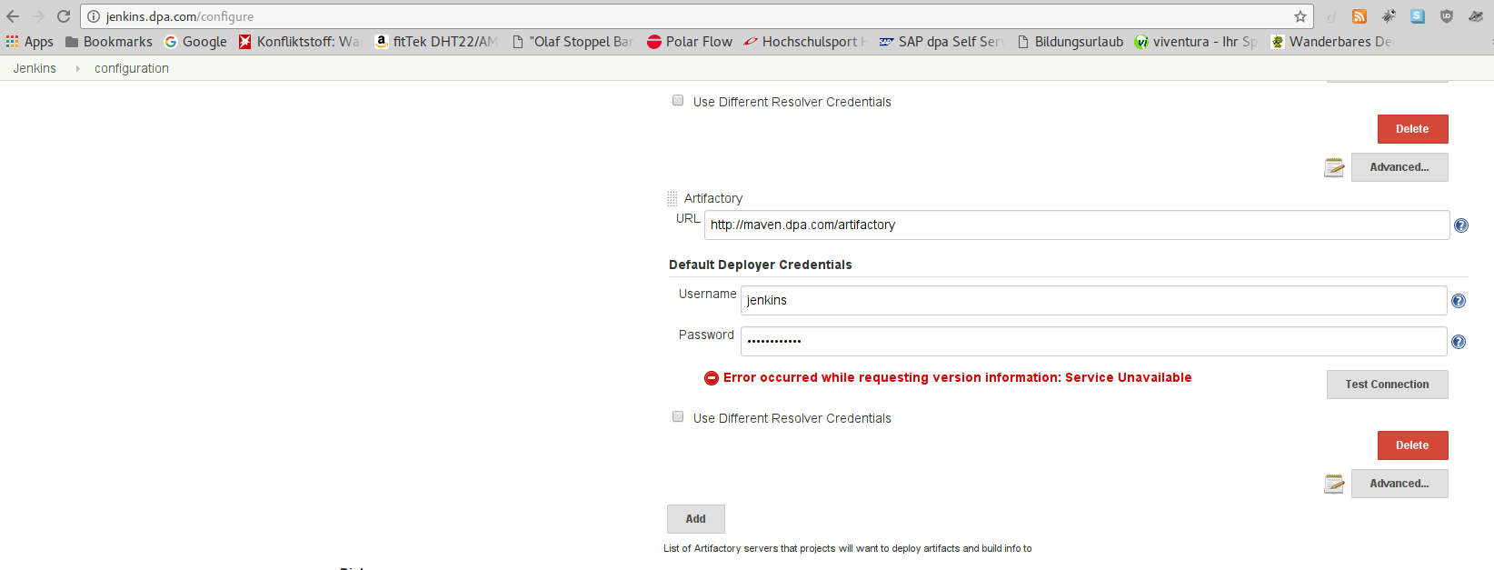 Further more we have the issue, that on the Jenkins -> configuration Page setup "Artifactory" the test to our "maven.dpa.com" fails! When we delete the proxy settings complete, it works.
