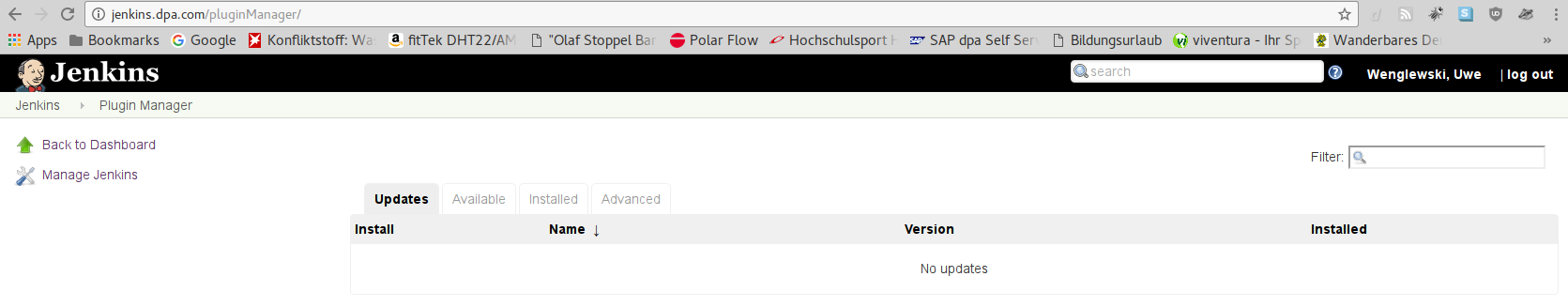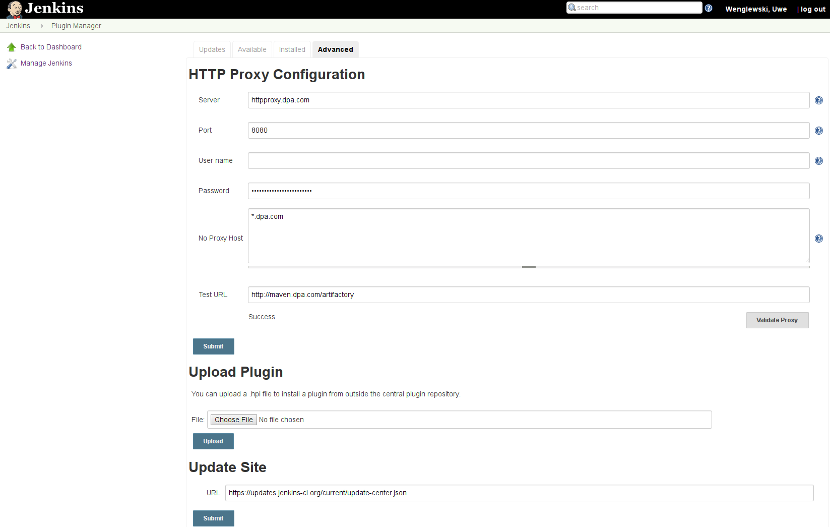Jenkins -> Plugin Manager -> Updates shows "no available". On "advanced" we have set up our proxy settings including exception "*.dpa.com" for our domain.