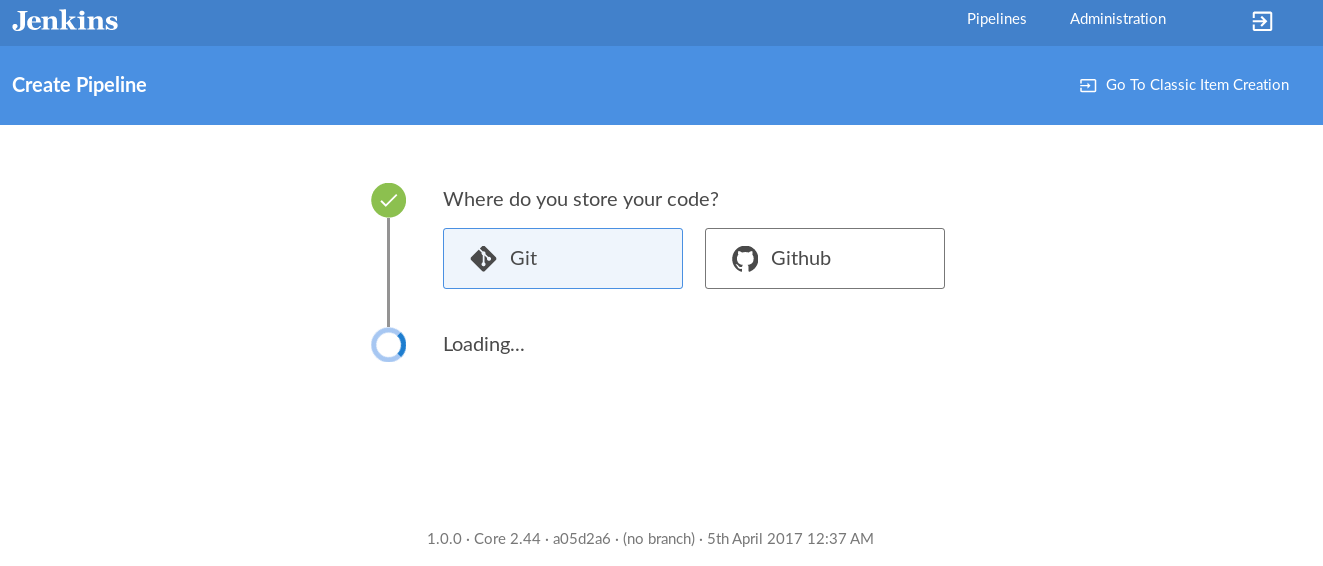 Jenkins "hangs" on "Loading..." after choosing "Git" as a code repository in the new Create Pipeline wizard if anonymous user is used (local Jenkins with disabled authentication). Under the hood there is 404 Not found error while accessing: http://localhost:8080/blue/rest/organizations/jenkins/credentials/user/