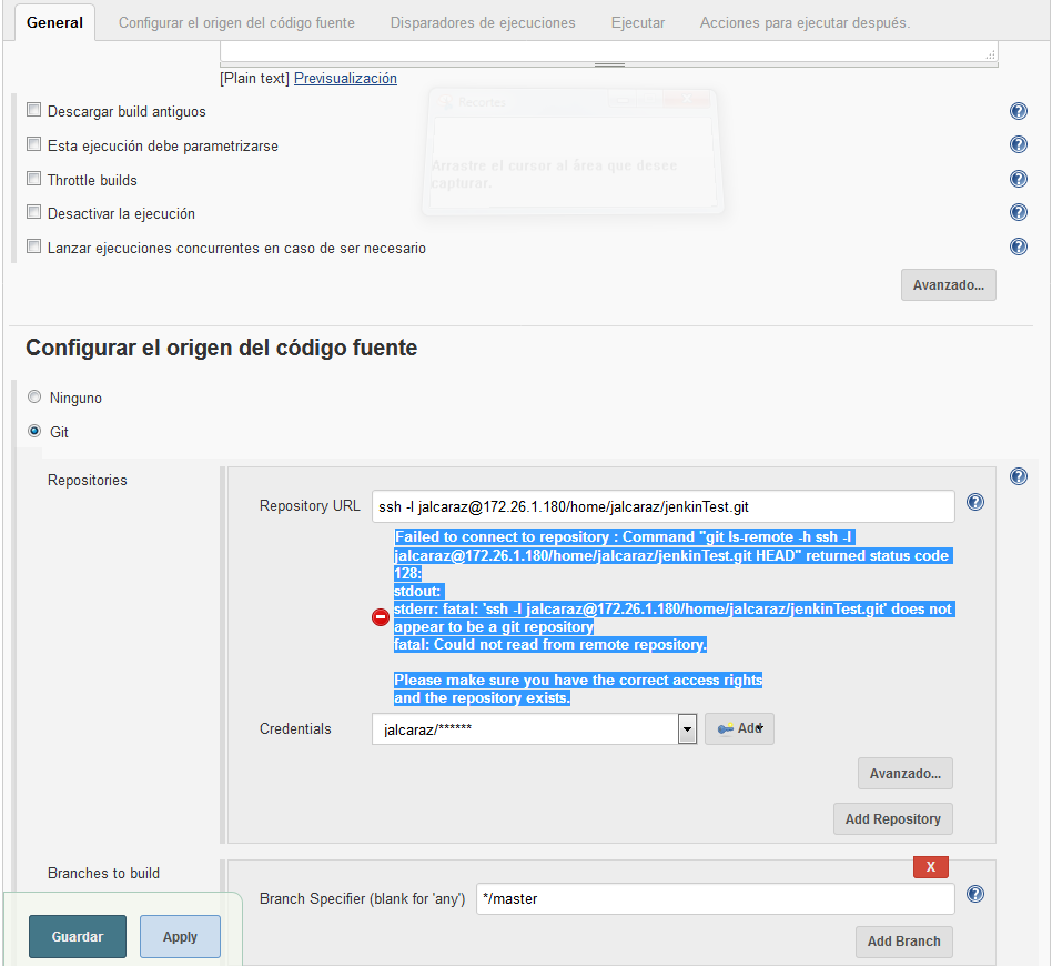 stderr: fatal: 'ssh -l jalcaraz@172.26.1.180/home/jalcaraz/jenkinTest.git' does not appear to be a git repository