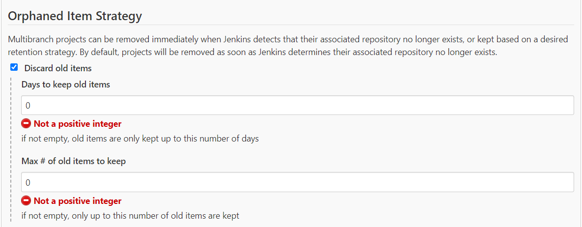 Multibranch pipeline orphaned item strategy can't be set to 0