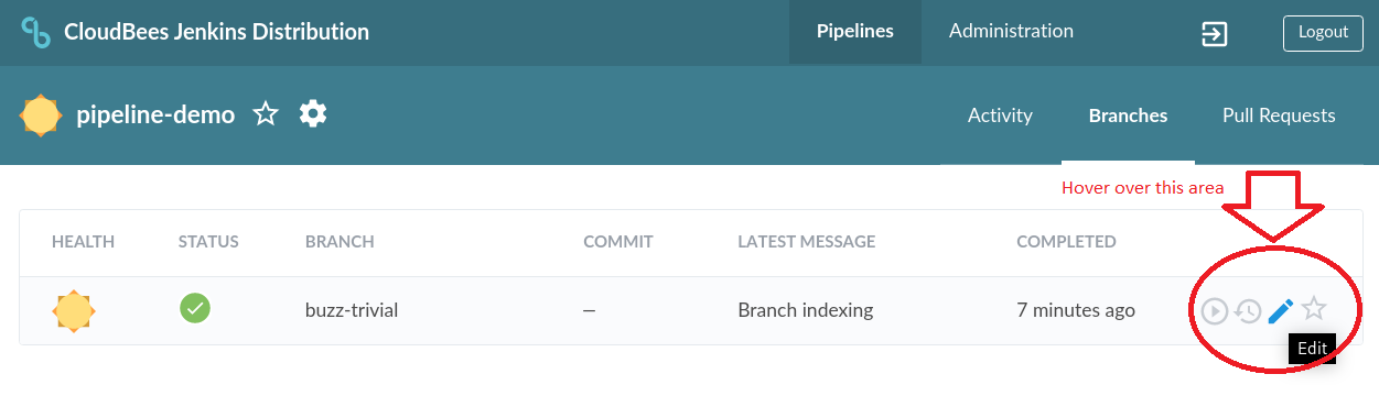 7. When the Pipeline editor prompts that there are no branches containing a Jenkinsfile, press the "Create Pipeline" button