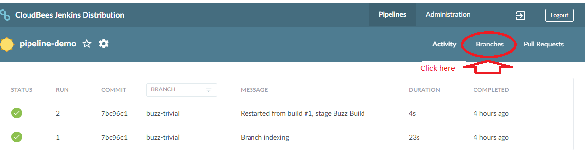 10. Save the Pipeline to a new branch (example uses branch 'buzz-trivial')
