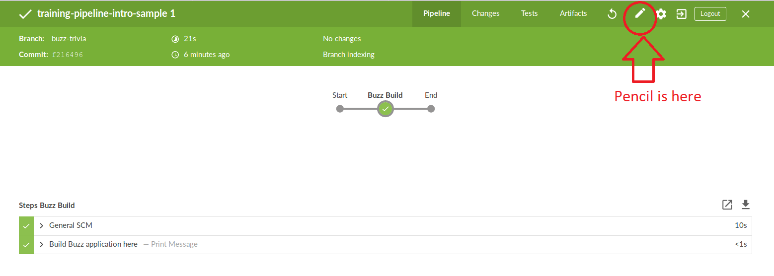 Blue Ocean plugin versions some time prior to 1.10.2 provided a "pencil" icon in the top bar that allowed the user to invoke the Blue Ocean editor to edit the Pipeline. Instructions to see the Pipeline are included in the "Pipeline Basics" section of the "Jenkins Fundamentals" class and in the "Pipeline Fundamentals" class.