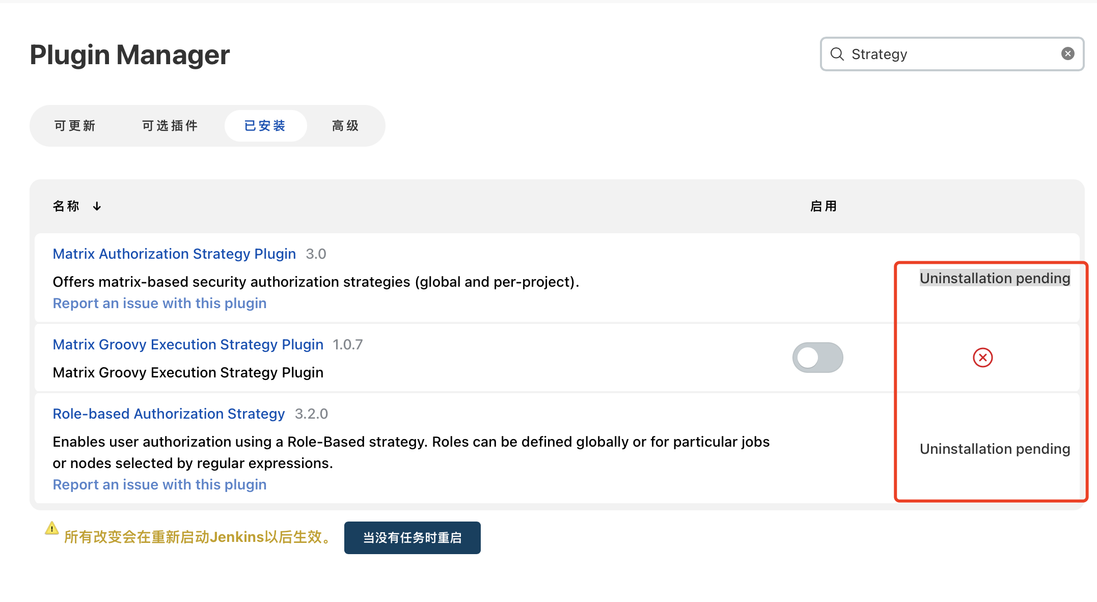 jenkins Plugin Manager uninstall error Uninstallation pending