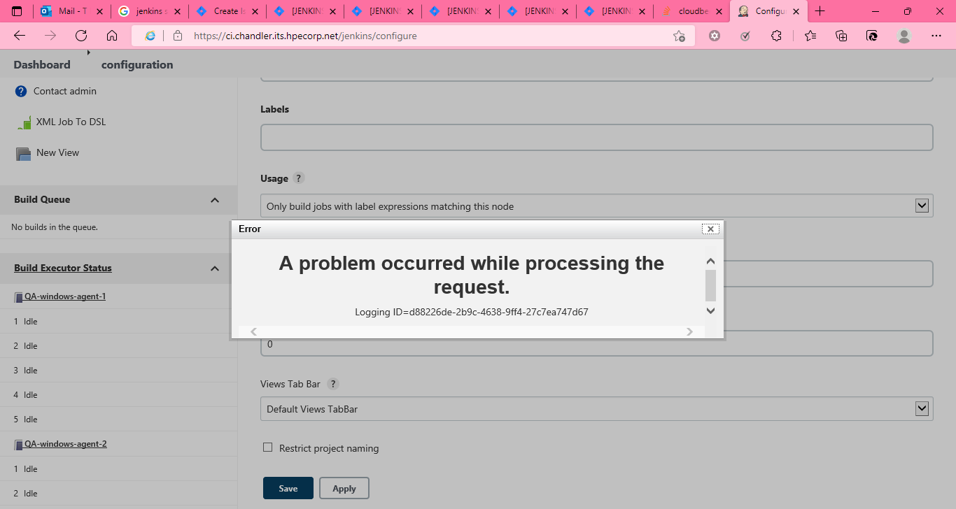 The Save and Apply button in configure system of manage jenkins is throwing error. It is saving the data, but throwing error.