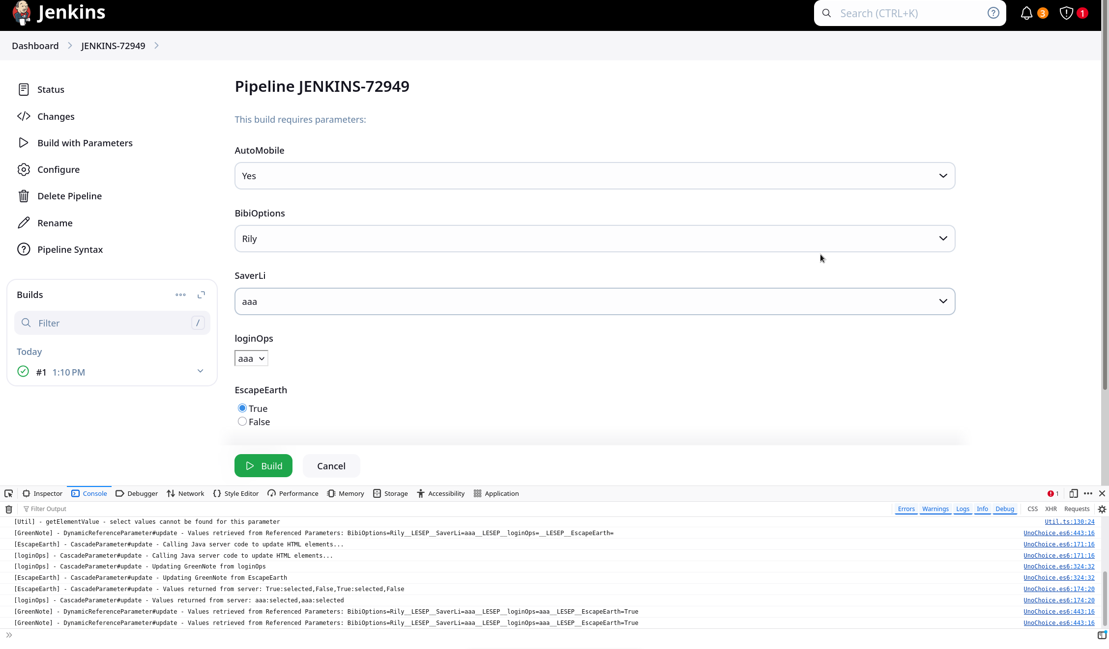And I access at build parameter page, I cannot select parameter value of "LogOptions" parameter. only loading status showing. This parameter type is "CascadeChoiceParameter. I think CascadeChoiceParameter have bug. have you try to check this bug please?