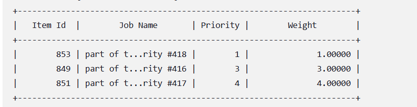 Sorted 2 hudson.model.Queue$BuildableItems with Min Weight 2 and Max Weight 5 Apr 16, 2025 3:41:30 PM FINER PrioritySorter.Queue.Sorterhudson.model.Queue$BuildableItem Queue: +----------------------------------------------------------------------+ | Item Id | Job Name | Priority | Weight | +----------------------------------------------------------------------+ | 965 | part of t...rity #472 | 2 | 2.00000 | | 961 | part of t...rity #470 | 5 | 5.00000 | +----------------------------------------------------------------------+