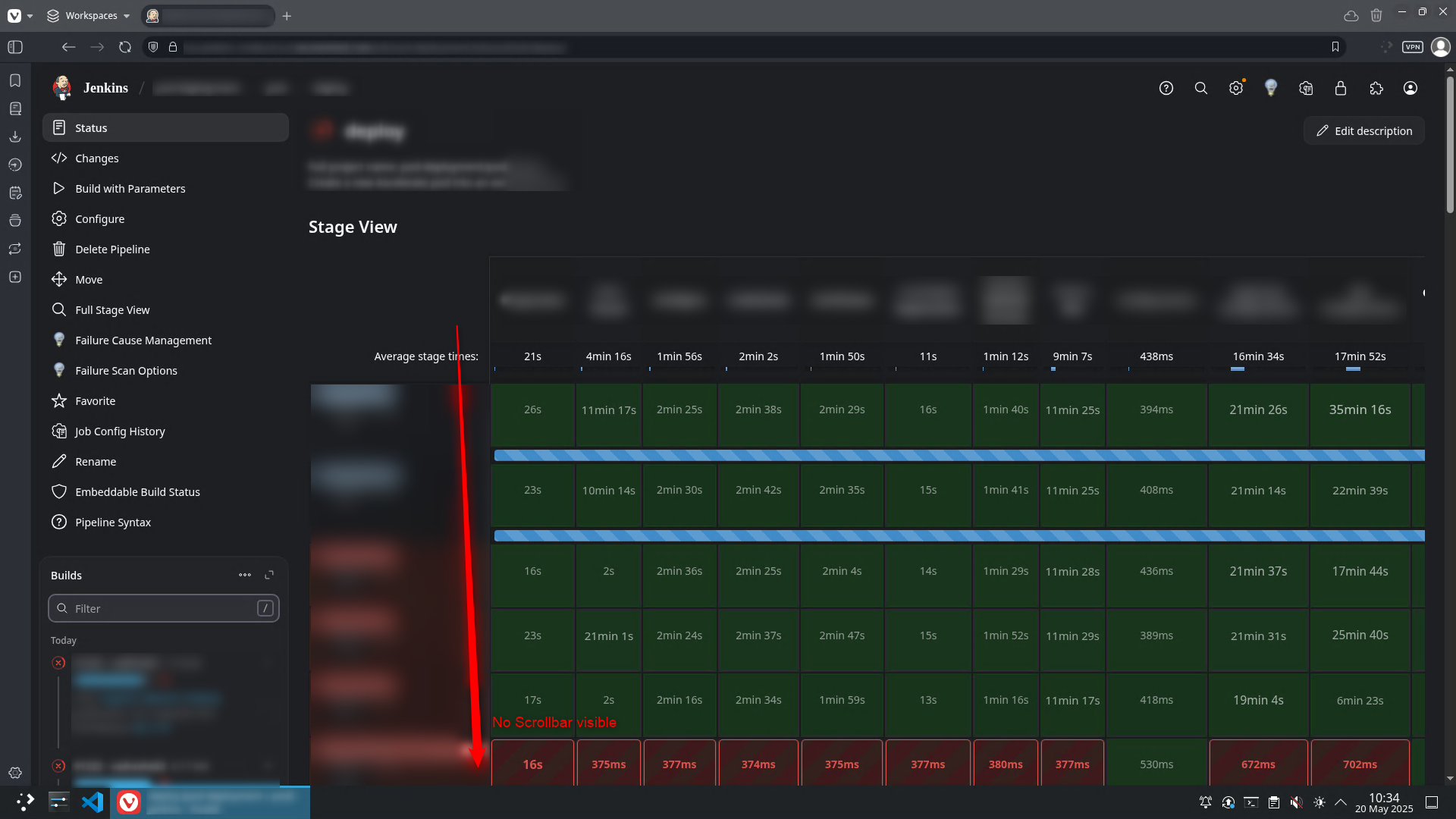 On recent versions of Jenkins with the stage view plugin installed, the horizontal scrollbars are no more easily reachable when dealing with a longer job history.