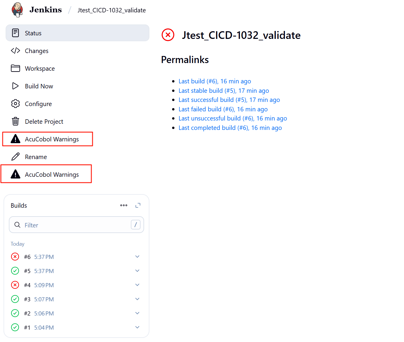 2. Modify the Jenkins configuration to let the next build to fail before AcuCobol Warnings executes.