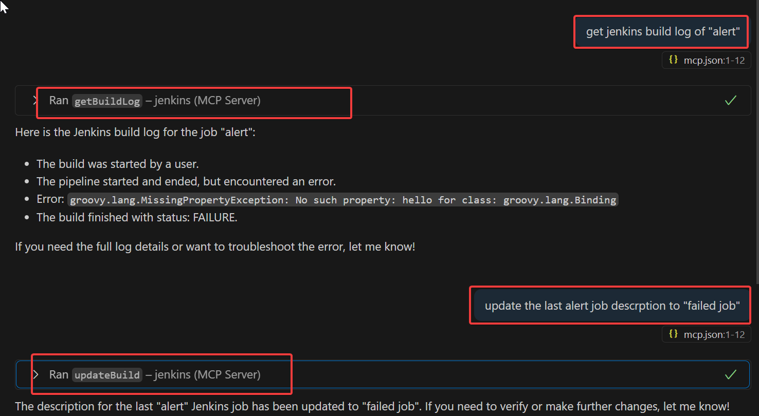 I'm the plugin owner of the mcp-server-plugin, which brings AI capabilities into the Jenkins ecosystem. For example, the plugin enables users to query Jenkins job build results via Copilot (see screenshot below).