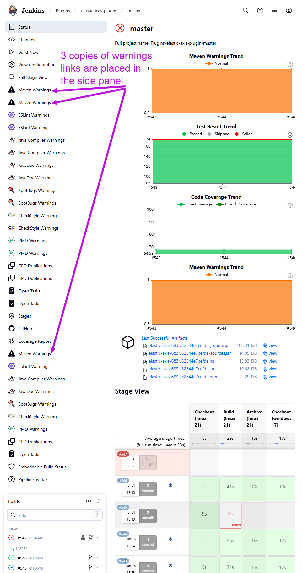 When a plugin build fails on ci.jenkins.io and on my local system that uses the buildPlugin() Pipeline library, three copies of the warning links are added to the side panel of the job. It looks like this: