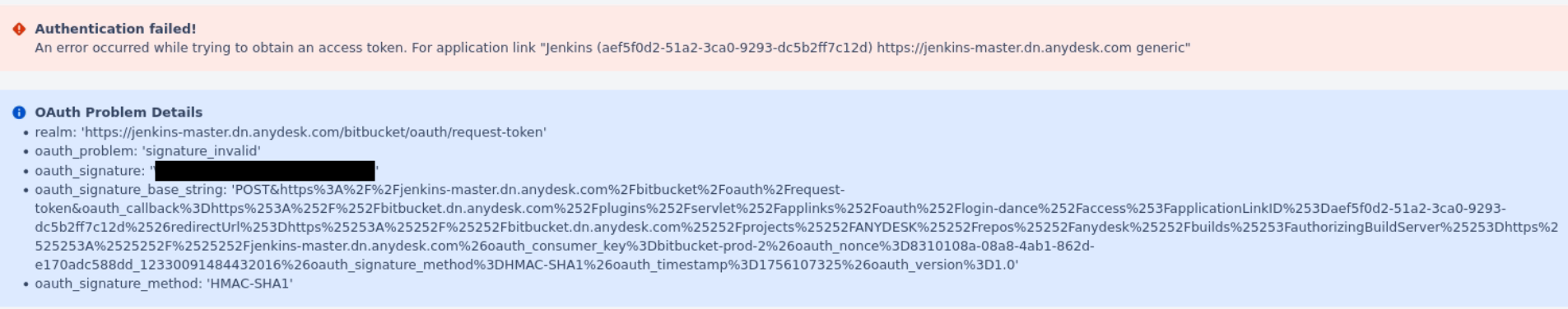In the Bitbucket Builds page, when clicking on "Authorize actions" on any build and confirming the redirection, the OAuth error "signature_invalid" is thrown:
