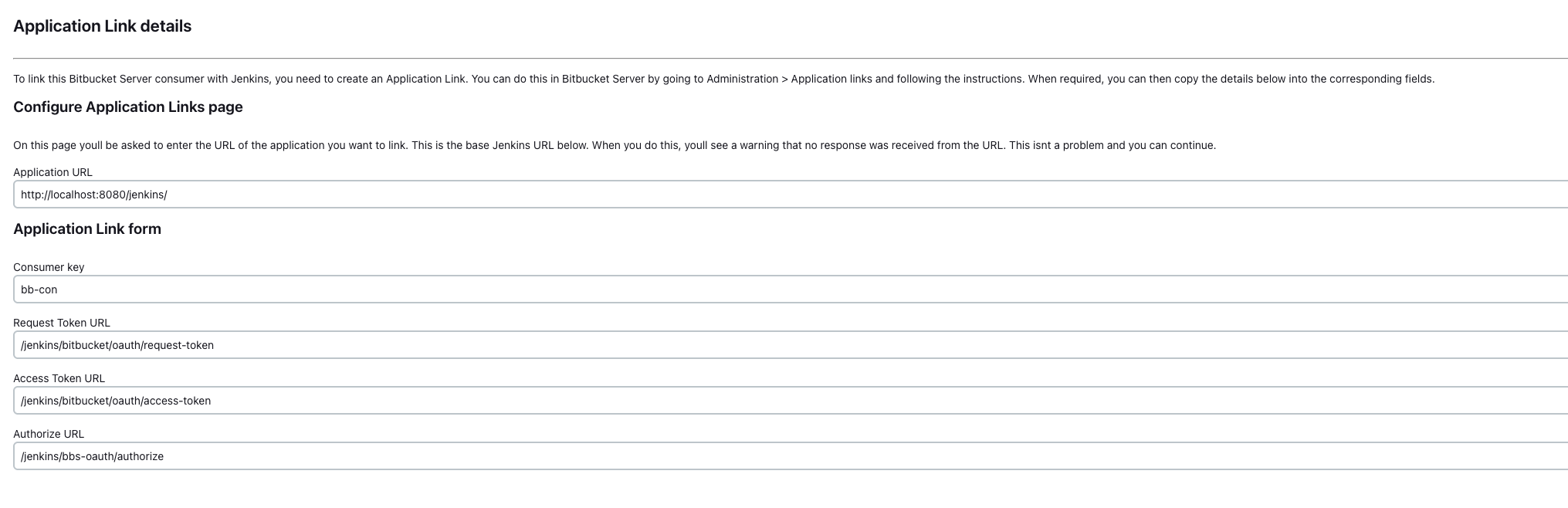 The error persists after recreating the application link on Bitbucket and the OAuth consumer configuration on Jenkins.