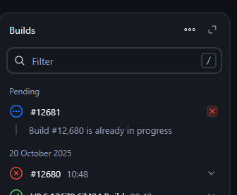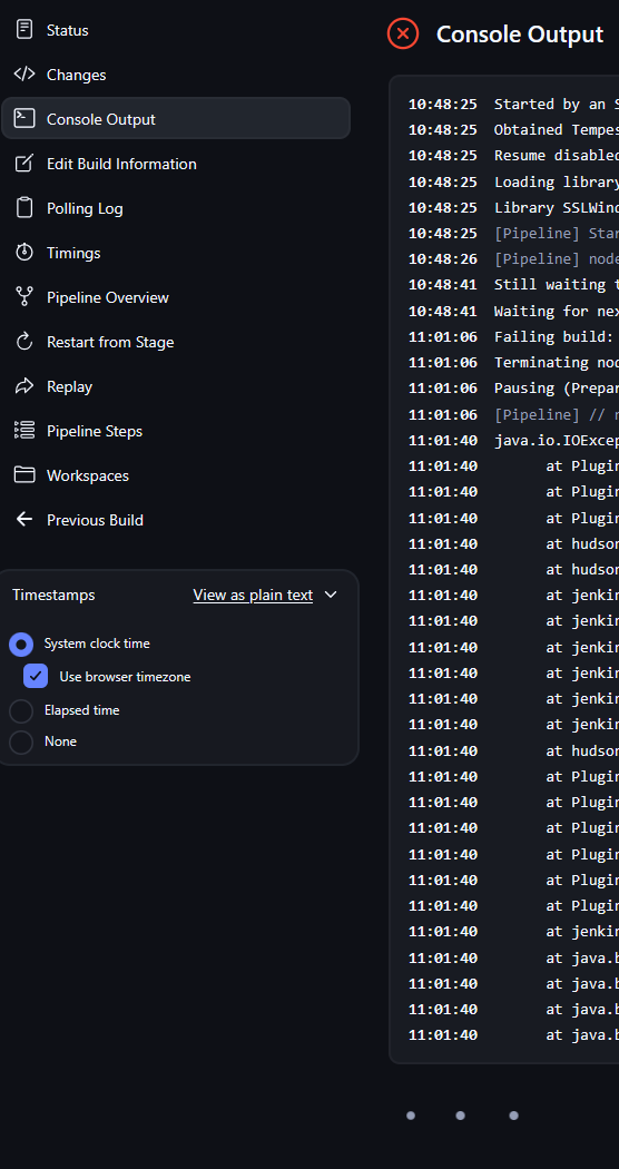 As you can see in this image the job is marked as failed but the dots at the bottom show Jenkins is still waiting for more from the job.