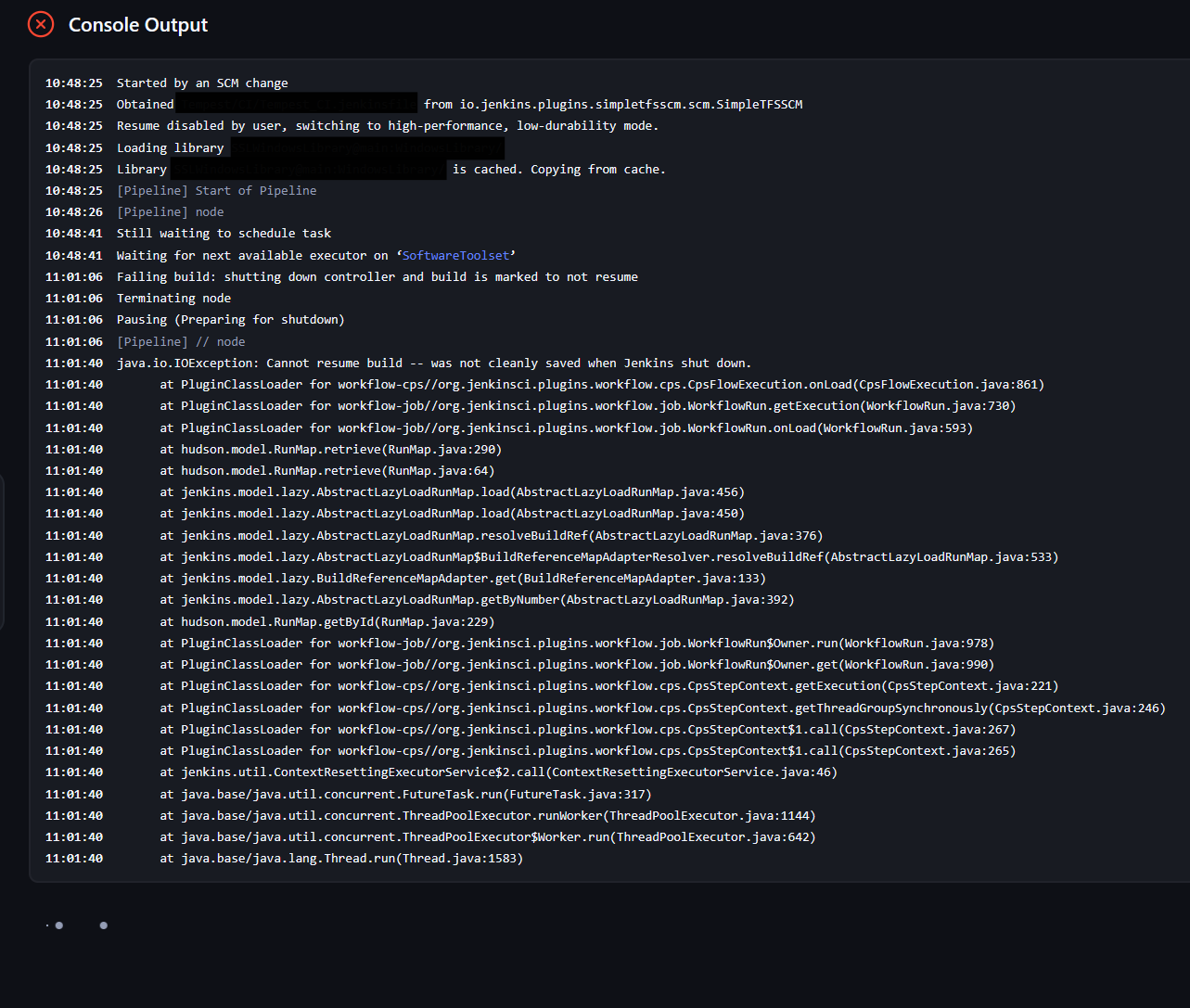 It likely has something to do with the durability settings as the pipeline durability setting is set to Performance Optimized and the job is set not to resume. It could also have something to do with the custom SCM plugin I'm using (but seeing as this job hasn't started the checkout yet I'd be a little surprised).