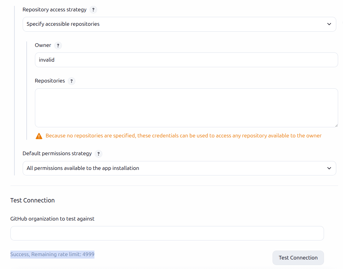 Test Connection is only using the provided ''GitHub organization to test against'' as owner of the check, reporting a misleading success.